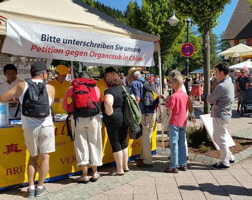 二零一六年八月十三日,在德国著名景点缇缇湖(TITISEE)举办的“制止中共强摘器官”征签日上,来自比利时的Sideris女士和几个朋友主动过来签名,支持法轮功学员反迫害。法轮功学员问她以前是否听说过中共强摘器官的事,她说:“我在电视上看到过报道,这实在是太残忍了,太残忍了!在当今社会上发生了这样的事,这是人类的耻辱!”