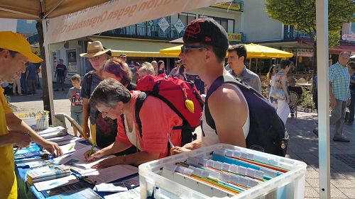 德国的Schneide先生路过信息台,被展板上的信息震惊了。他停留了很长时间,仔仔细细把每块展板都看了一遍。他说自己是第一次知道中国发生了这样的事,真令人难以置信!签名后他鼓励学员继续披露真相,曝光罪恶,大家携手尽快制止罪行。