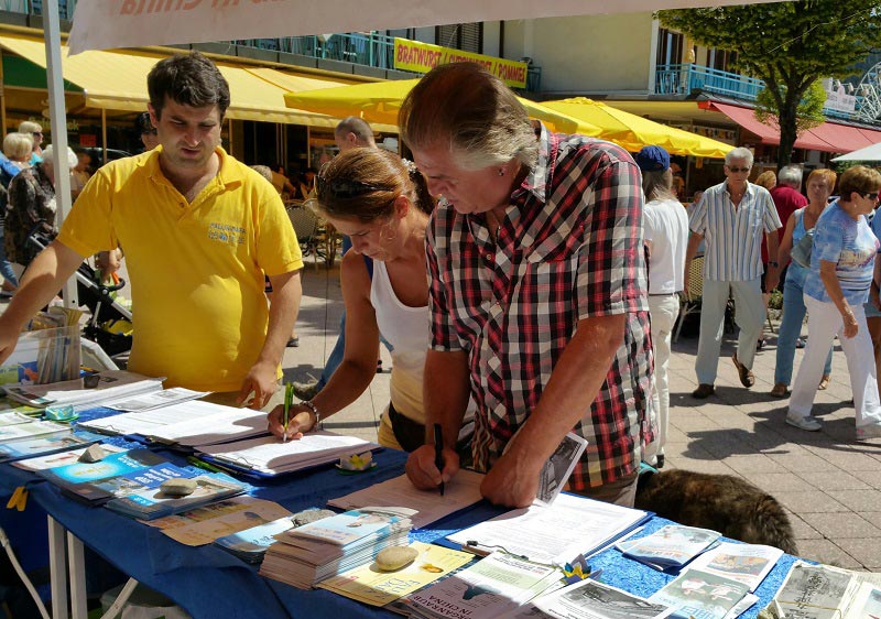 Hoffmann先生带着一双儿女径直走到信息台前问:“我能做点什么?”当得知有反强摘器官的征签后,他马上表示要签名。看到签名表上需要填写地址,他问:“我在波兰、德国、瑞士都有住处,应该填哪个地址?”学员说这是全球范围的征签反迫害活动,只要是真实的,写哪个都行。他签完后问身旁的女儿:“你是否同意抢夺别人的心、肝、肺去做器官移植手术?”女儿摇摇头说不。他说:“那我们都签名吧。”女儿接过父亲递过来的笔,签上了自己的名字。