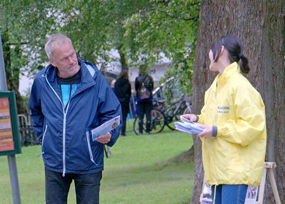 第四届挪威北极自行车赛在挪威举办,比赛经过的城市都会有众多的挪威居民前来观看。法轮功学员在车队必经处展示功法、讲真相。