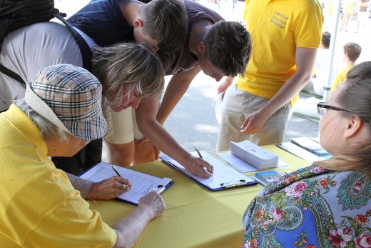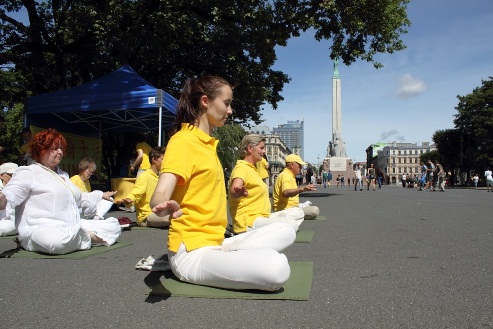 游行队伍最后停在里加市最繁华热闹的“自由纪念碑”旁边,开始长时间的讲真相活动。在那里,法轮功学员集体炼功,同时通过扩音器讲述迫害事实,旁边还有呼吁人们声援法轮功反迫害的征签台。大批市民和游客听闻真相,并签名支持法轮功。