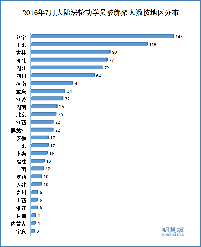 ![]() 图1:二零一六年七月份大陆法轮功学员被绑架人数按地区分布 |