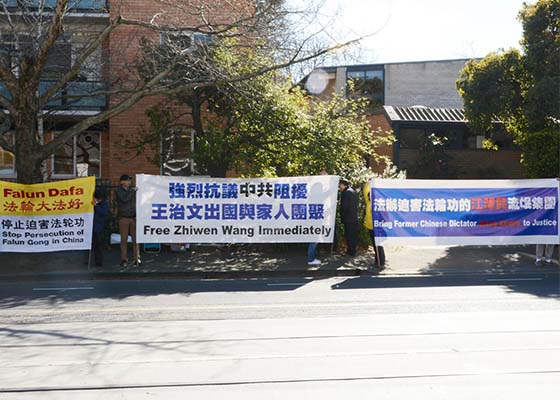 墨尔本的法轮功学员在当地中领馆前举行抗议活动,促中国现政权立即重发护照给王治文,使其可前往美国与女儿女婿团聚。