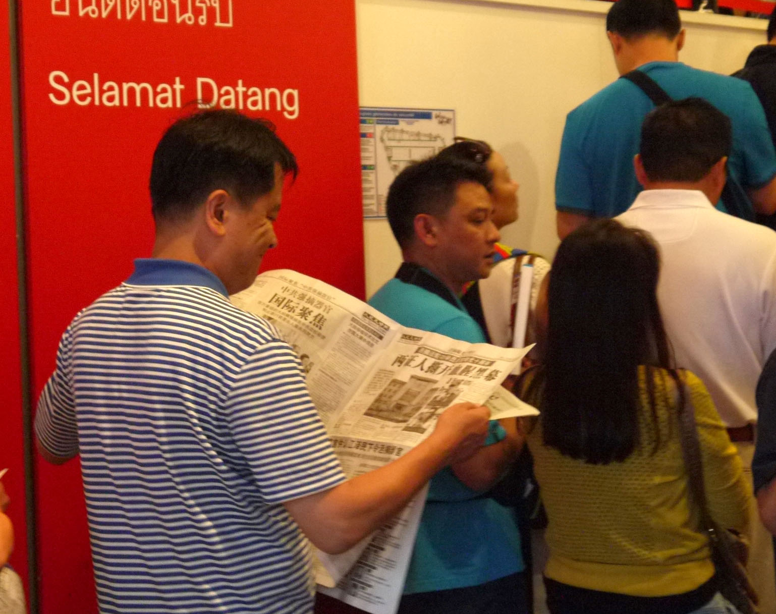 图1-2:大陆游客在巴黎拉法耶特商场免税店边排队边看真相报