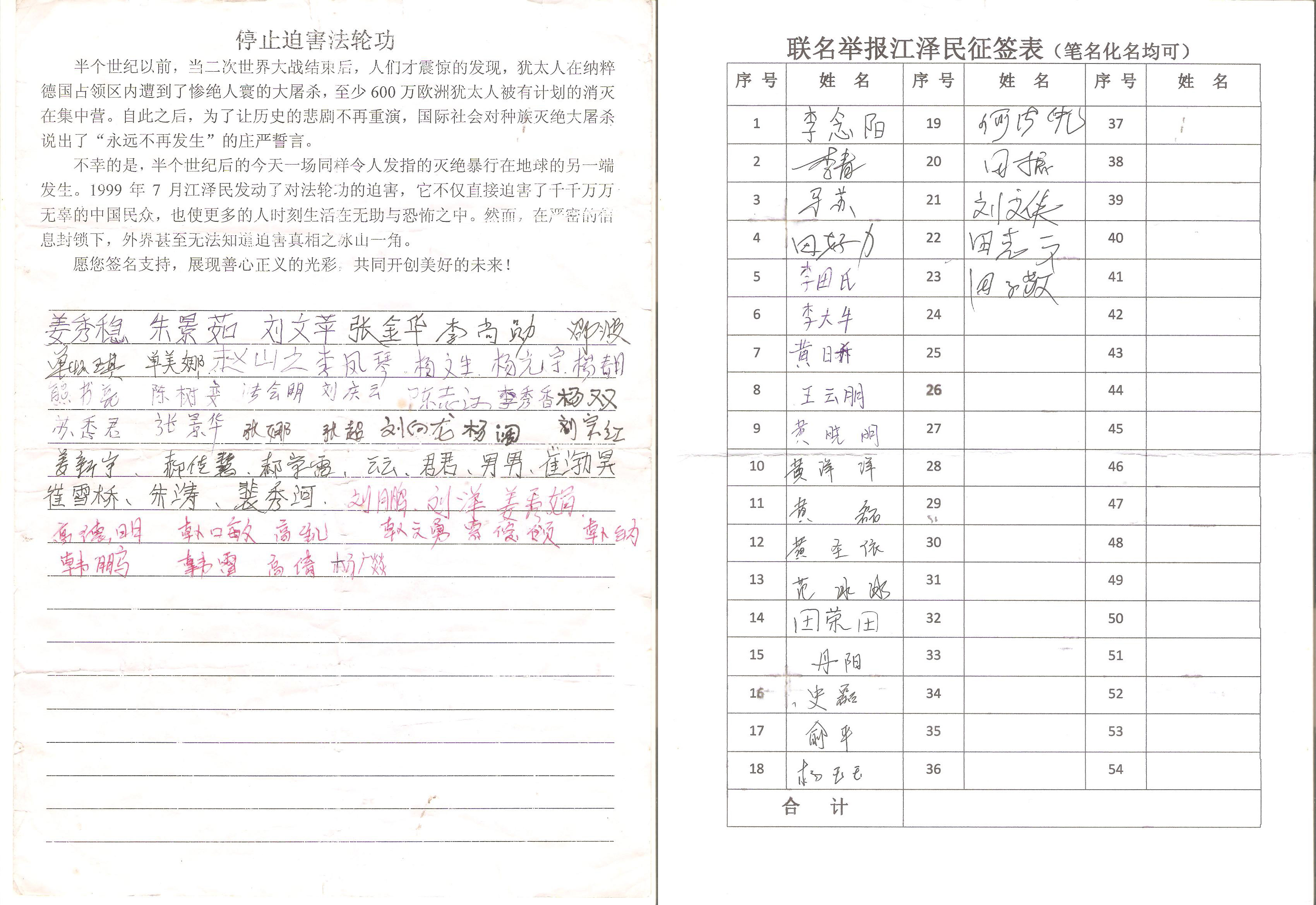 在蔬菜批发部,有当地菜农和远一点的农民,他们听说签名举报江泽民,劲头可大了,其中一农民说:“早就盼望这一天,江泽民没有给我们一点好,给我们带来的都是苦难”。当时六个人签了名。
