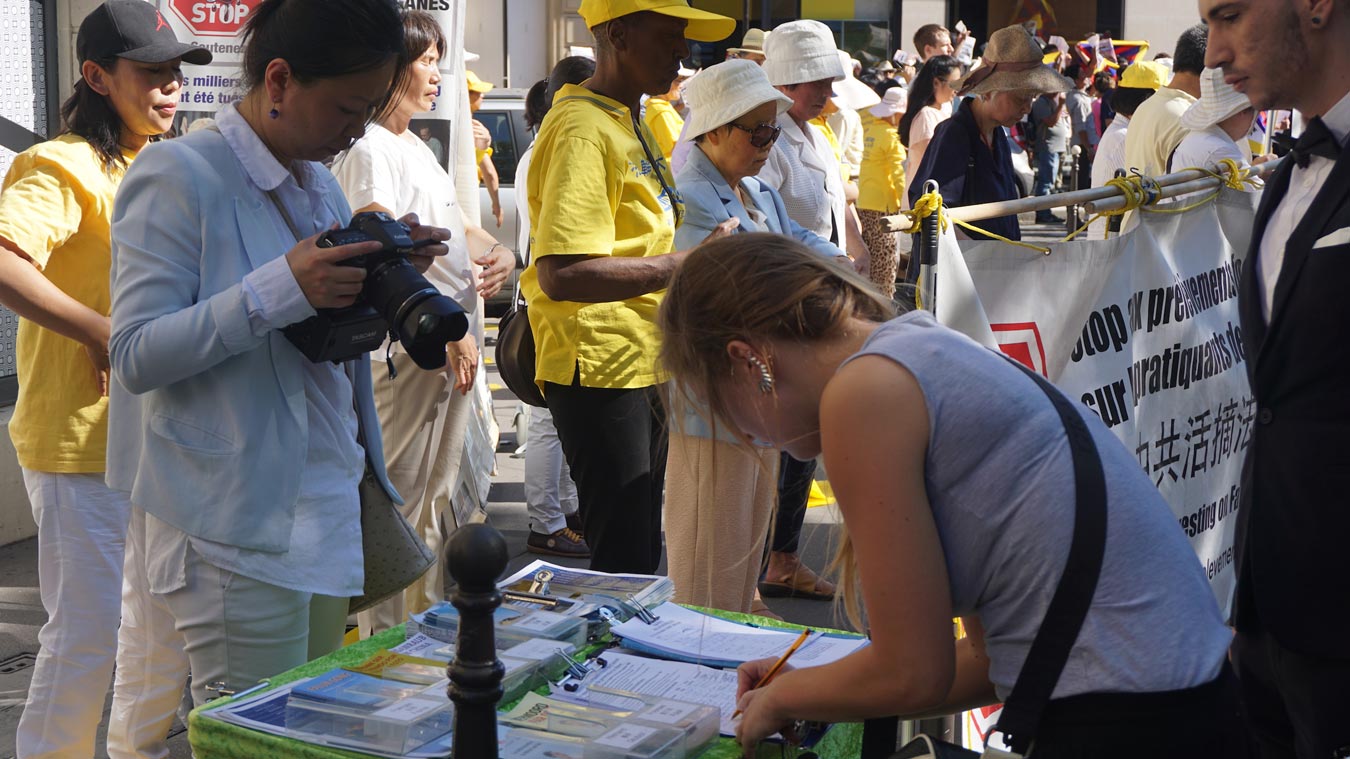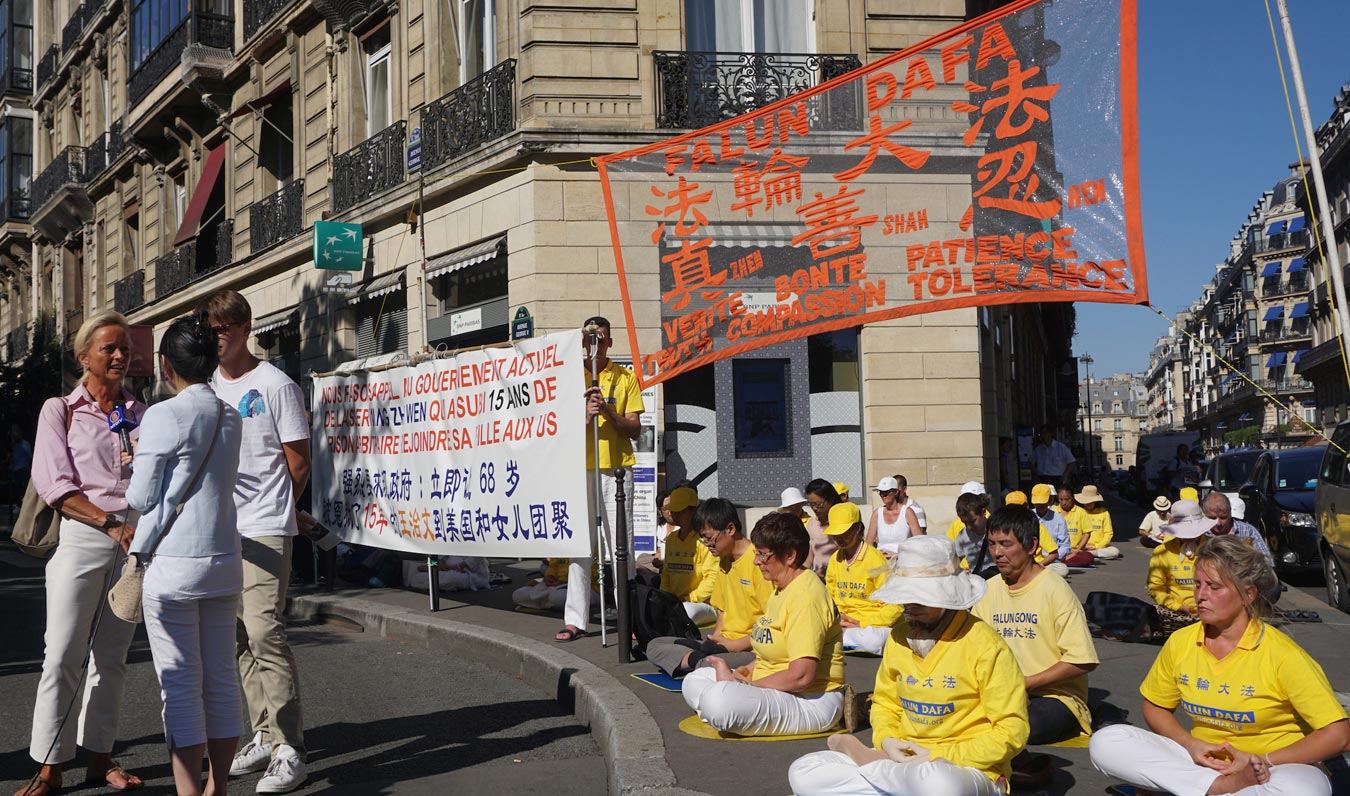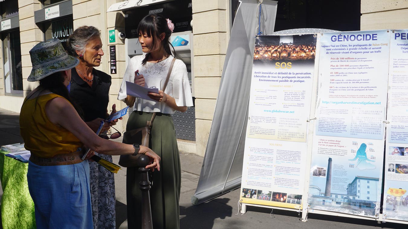 当天的巴黎,烈日炎炎。法轮功学员们在高温下祥和地炼功,并向过往行人揭露中共对法轮功的残酷迫害。在了解真相后,他们纷纷谴责中共的迫害行径,并表示对法轮功学员的支持。