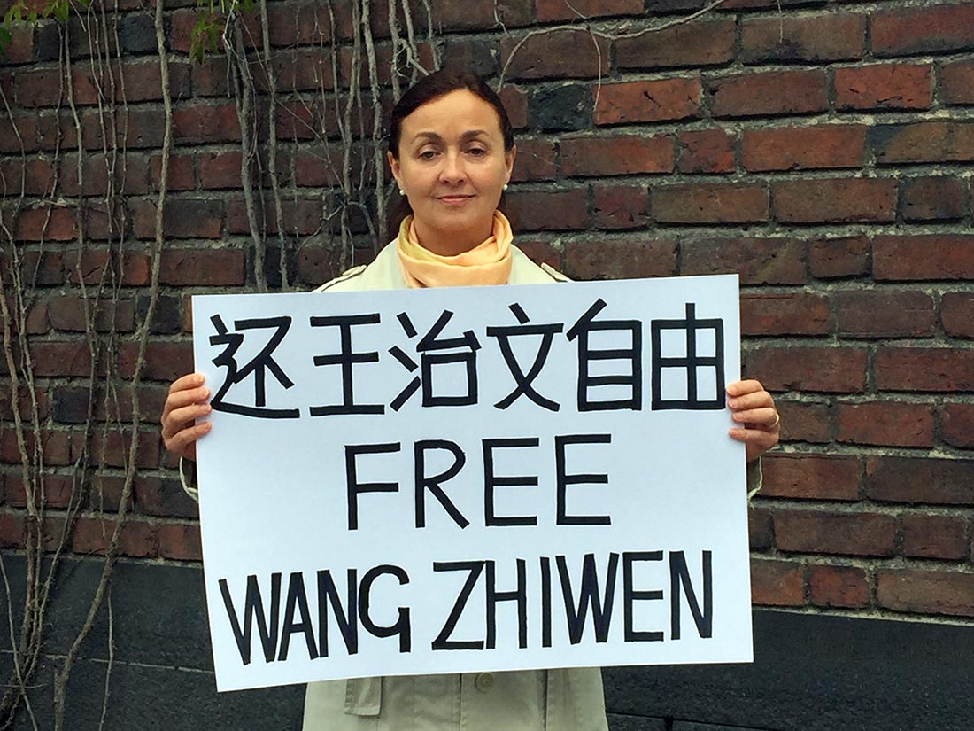 法轮功学员克里斯蒂娜(Kristina),是一位芭蕾舞蹈教师和编导,她的丈夫温纳(Werner),是一名空手道教练,同时也是一名企业家,他们有三个可爱的女儿,全家人都修炼法轮功。他们共同的心愿就是:制止中共迫害法轮功!克里斯蒂娜(Kristina)代表全家抗议中共阻挠王治文赴美与家人团聚,呼吁中共现政权早日法办江泽民、立即停止迫害法轮功。她说:“对法轮功的这场残酷迫害是时任中共党魁江泽民一手发动的,至今已经十七年了,仍在继续。中国的法轮功学员不但被抓、被关、被酷刑折磨、被活摘器官,甚至连拥有身份护照、出国旅行的权利也被剥夺,这是任何一个民主国家、讲人权的国家都不能容忍的。我们要求中共当局立即还王治文自由,使他能出国与在美国的家人团聚。”