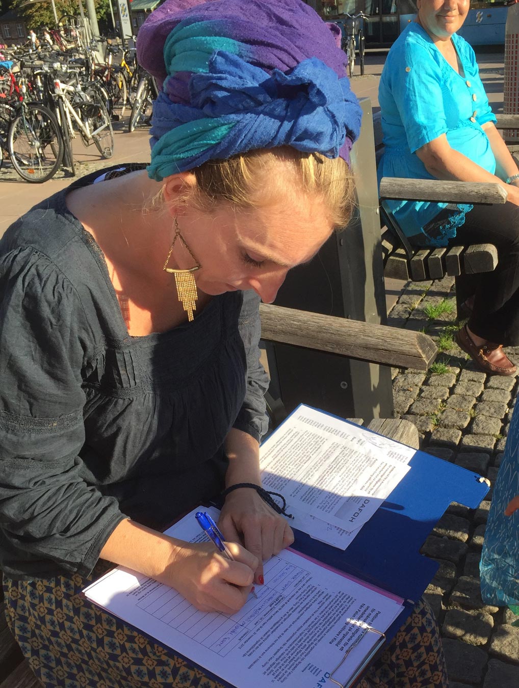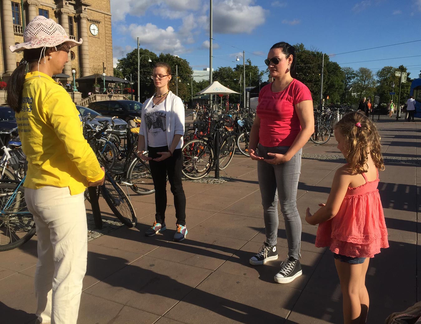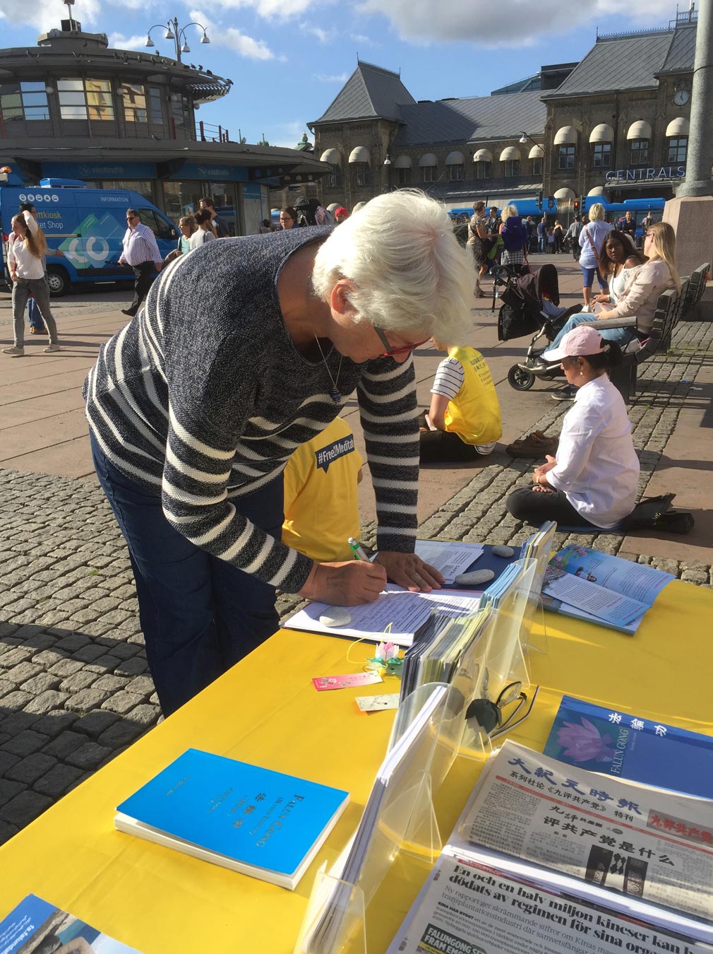 法轮功的展位设立在皇后广场,哥德堡交通枢纽火车总站的附近(Drottningstorget.)。这里每天上下火车的人很多,特别是在哥德堡文化周期间里,这里显得更加热闹。法轮功学员在展位的上方挂上了黄底红字的“法轮大法好”的横幅,在白帐篷的衬托下,很是显眼。法轮功学员向人们展示着五套功法,吸引过往行人驻足观看,还有的跟学员攀谈。法轮功学员给他们讲述了中共十七年残酷迫害法轮功,甚至活摘法轮功学员器官等恶行。当人们听到中共的这些暴行后,毫不犹豫在支持法轮功学员反迫害,反对活摘器官的征签表上签名。还有不少民众对法轮功感兴趣,主动要求法轮功学员教他们法轮功功法。