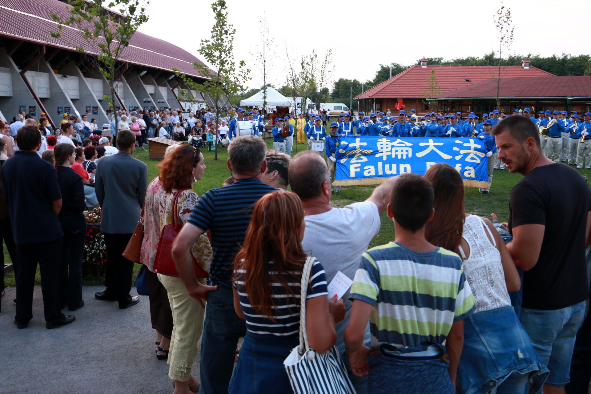 当天晚上,天国乐团应Marahalom市长的邀请,移师至该市著名的马术剧院,在匈牙利国庆节特有的史蒂芬王马术演出前为观众演奏。不少观众通过天国乐团的演出第一次了解了法轮功,有的还签名支持制止中共活摘法轮功学员器官的虐杀。