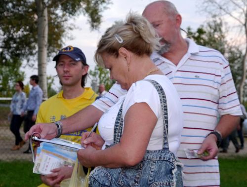 看着眼前如此祥和展示功法的法轮功学员和手中传单上揭露的关于中共活摘法轮功学员的罪行,Tobias夫妇马上询问哪里可以签名反对活摘。签名后,Tobias太太还谈到,观看法轮功学员的功法演示,让人感到平静。她并说:他们曾经在网上和媒体上看到过关于法轮功和对法轮功迫害的报道,他们都确信,法轮功学员是好人。她认为:迫害好人是不人道的,毫无公平正义可言。所以她签名表达对法轮功学员的支持。