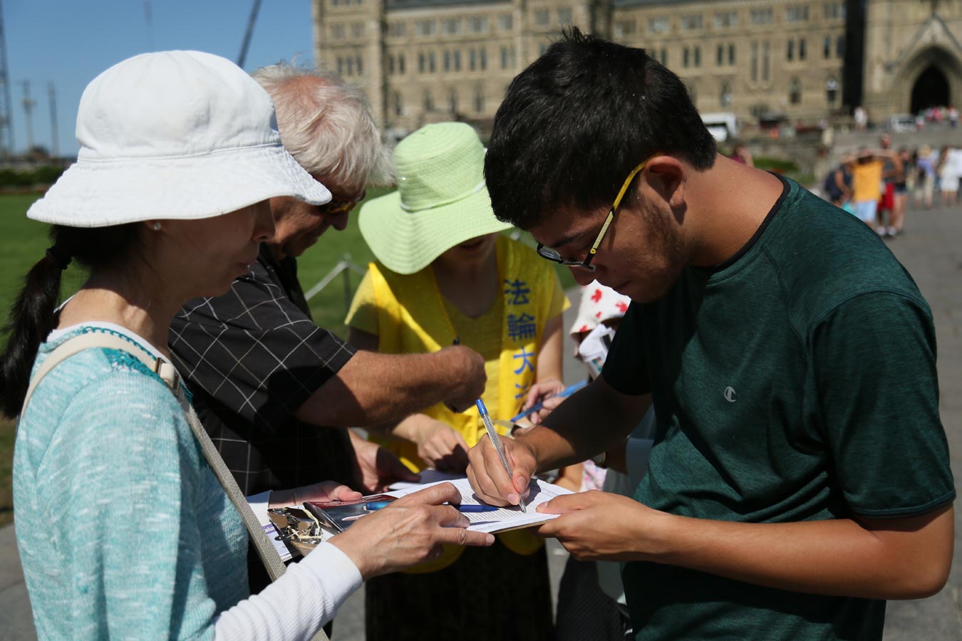 图2-5:八月二十六日,法轮功学员在加拿大首都渥太华国会山征签,呼吁即将访华的加拿大总理敦促中共停止迫害。