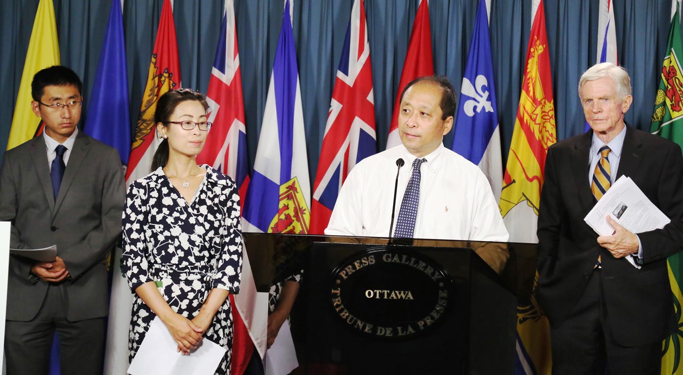 图6:八月二十六日,加拿大部份法轮功学员在首都渥太华国会召开新闻发布会,向即将在8月末出访中国,参加G20世界首脑峰会的加拿大总理特鲁多发出呼吁:敦促中共停止对法轮功长达十七年的迫害,释放包括十二名加拿大人的亲属在内被非法关押的法轮功学员,并将迫害元凶江泽民绳之以法。