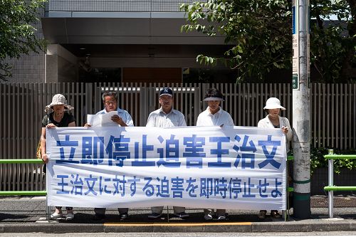 【明慧网二零一六年八月二十八日】二零一六年八月二十五日,日本东京的法轮功学员在中使馆前举行和平集会,抗议中共阻止王治文先生赴美与女儿团聚,要求中国现政权立即给王治文重发护照,还王治文先生自由,使其尽快与家人团聚。