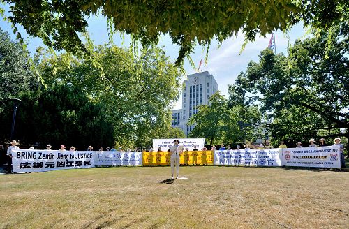 图1-5:温哥华的部分法轮功学员8月24日在温哥华市府门前召开新闻发布会,呼吁总理特鲁多总理在访问期间,敦促中共停止迫害法轮功