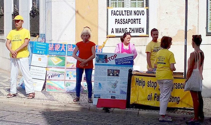 ![]() 图1-3:葡萄牙部分法轮功学员在里斯本中使馆前举办和平抗议,声援王治文。 |