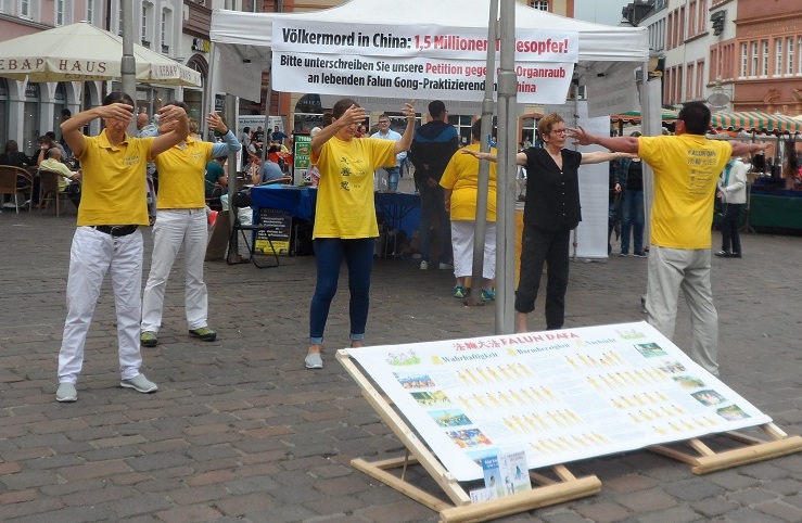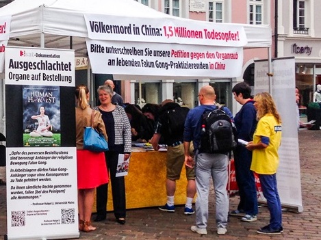 为了使公众广泛的了解中国法轮功学员正遭受活摘器官的迫害,来自莱茵兰—普法尔茨州和萨尔州的法轮功学员于七月中旬,在特里尔市中心的市场喷泉举办了公众集会和征集反对中共强摘器官罪行的征签活动。