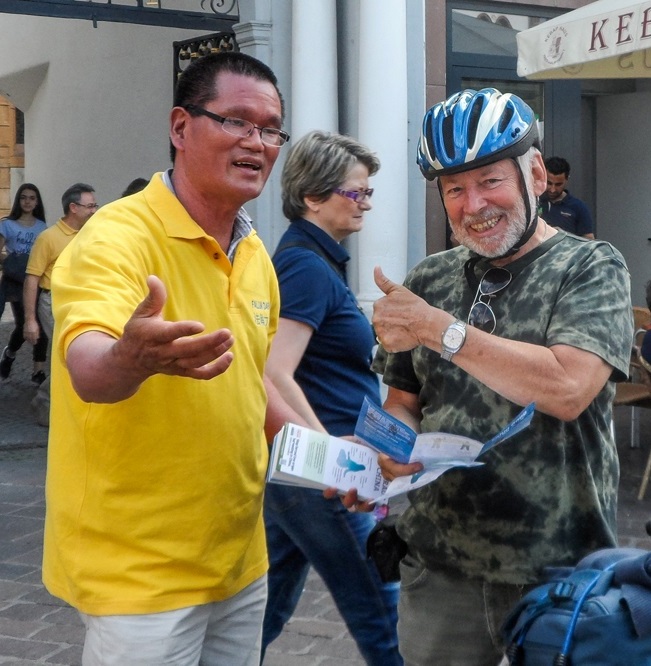 一位特里尔当地的导游正带团解说市场喷泉上的雕塑。随后,他请自己的团员都到展位签署给联合国、呼吁制止活摘的请愿书,他自己则带头第一个签名。