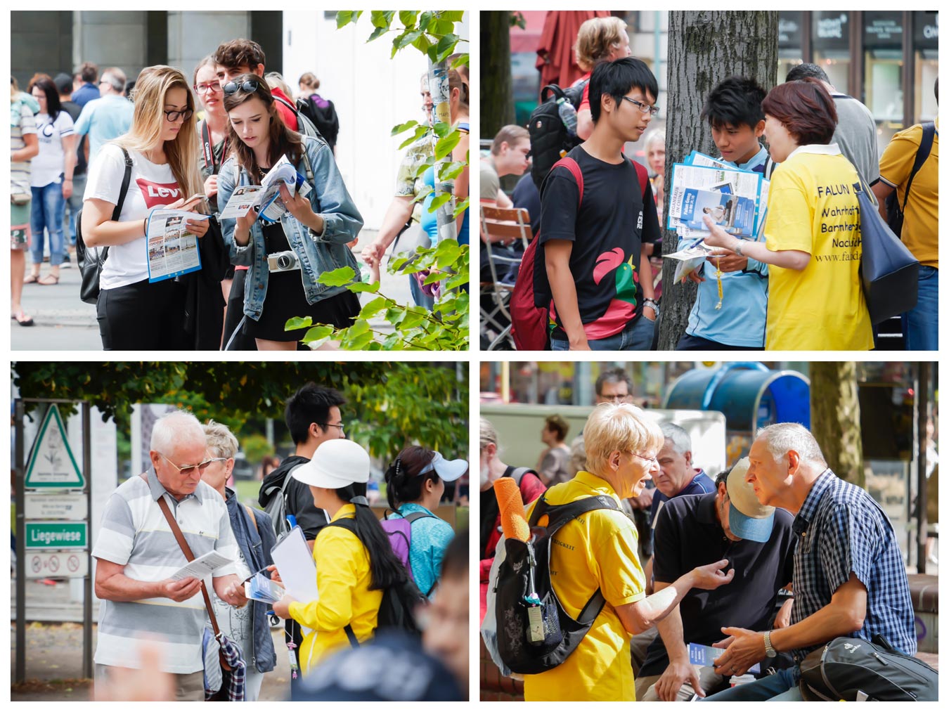 中午时分,当游行队伍在中领馆前Jannowitzbrücke大桥集会时,不少过路的民众被八十人的天国乐团的演奏以及法轮功学员的演讲所吸引,他们停下脚步聆听。