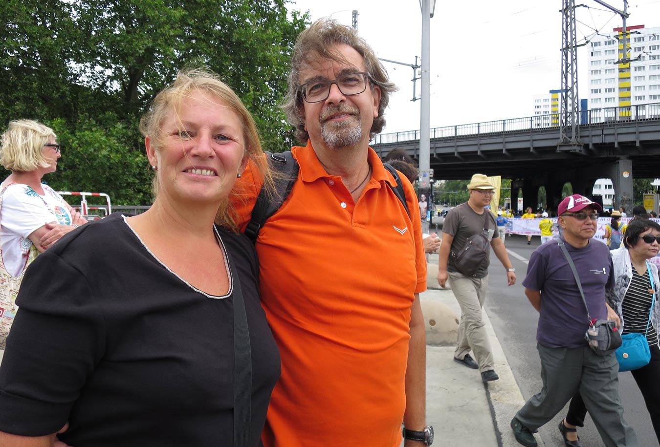 图8:法兰克福游客 Alexsandra Martius(左)和Bade先生 认为以游行等和平的形式反迫害很重要。