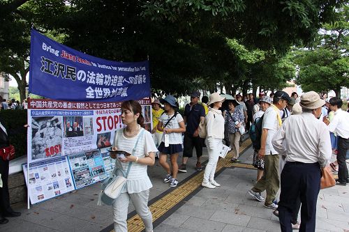 图:日本法轮功学员在广岛核爆七十一周年日来到广岛和平公园,向来自世界各地的民众揭露中共活摘法轮功学员器官的罪行,并征集签名声援诉江。 |