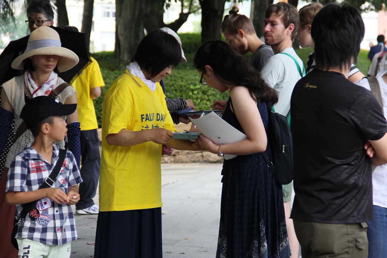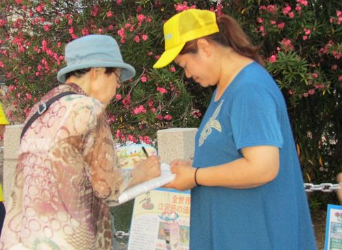 当天正值摄氏35度以上的高温,虽然汗流浃背,人们却顶着炎炎烈日驻足阅读法轮功的真相传单,观看真相展板和横幅,倾听法轮功学员讲述发生在中国的迫害,并纷纷署名加入和声援“诉江大潮”。