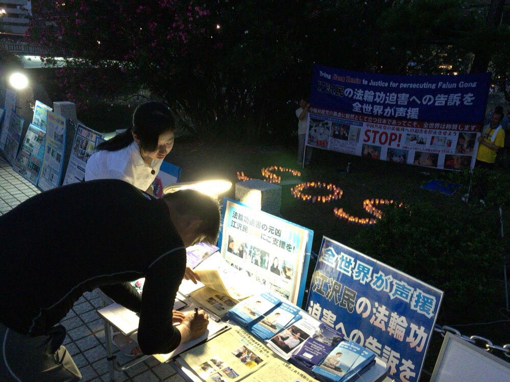 夜幕降临,学员们继续举行烛光守夜活动,悼念在中国被迫害致死的法轮功学员。夜色中民众继续签名声援诉江,当日有近千人在诉江控告书上署名。