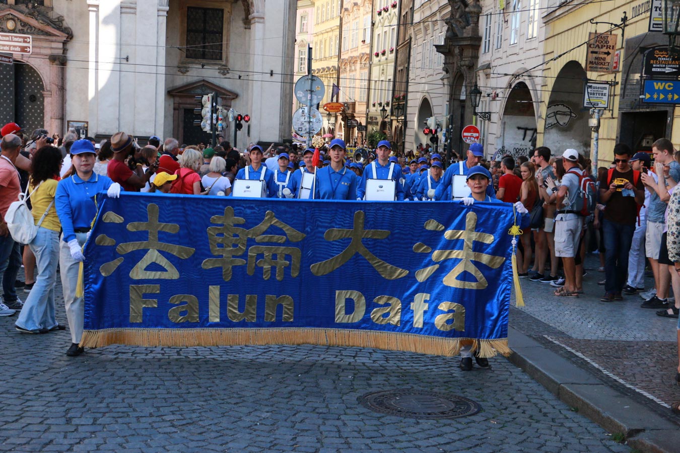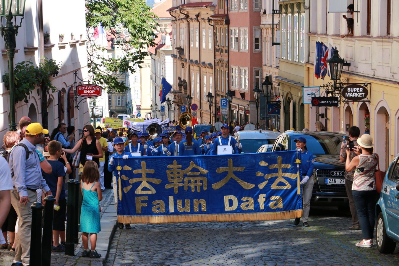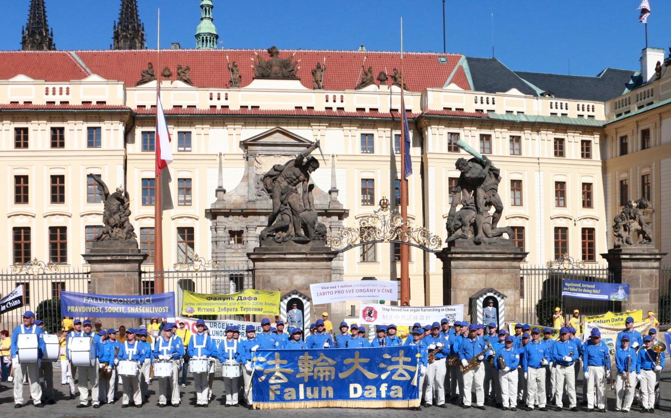 当游行队伍经过这些广场时,学员用捷克语和中文告诉人们法轮功是中国传统的修炼方法,教人遵循“真、善、忍”的原则。但因为以江泽民为首的中共政权惧怕上亿民众拥有自己的信仰,按照“真、善、忍”做好人,在一九九九年七月开始了对法轮功学员的残忍迫害。不仅将他们非法关押在劳教所、监狱,酷刑折磨他们,甚至还活摘他们的器官牟利。