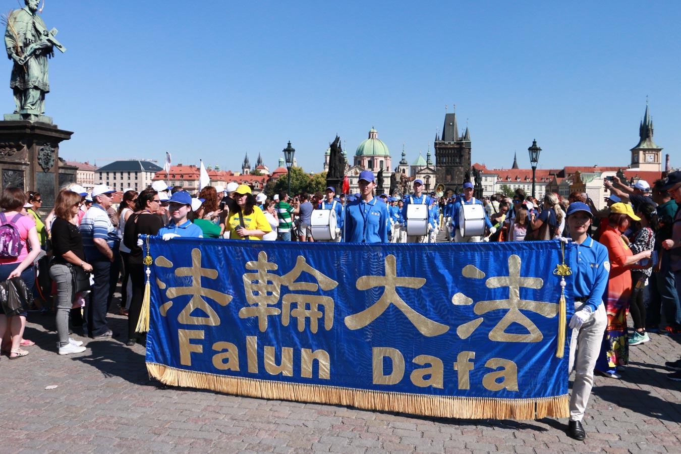 |  图4:在著名的查理大桥上人们驻足观看法轮功学员的演出及打出的横幅 |