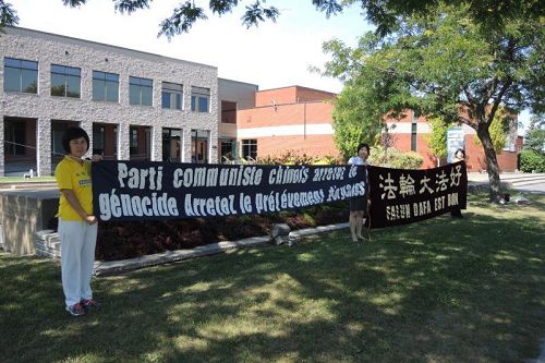 ![]() 图2-3:学员在Repentigny 市政大楼外拉起真相横幅并炼功 |