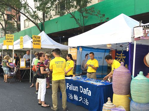 在纽约曼哈顿三大道热闹的街市上,充满纯正的能量的法轮大法展位吸引了众多有缘人驻足,了解功法,签名反迫害。