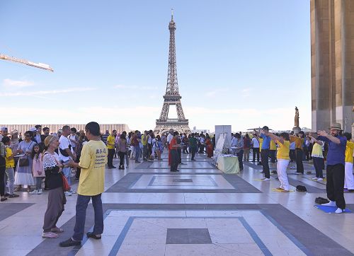法国的法轮功学员在艾菲尔铁塔下的人权广场向来自世界各地的游客讲述法轮功被中共迫害的真相,并征集签名制止迫害。