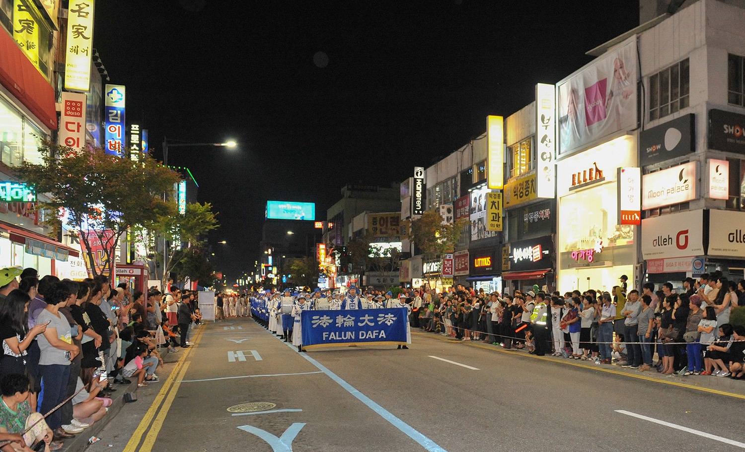 九月十日,韩国天国乐团参加了该庆典。从傍晚六点三十分开始在元一路展开的庆典游行,身穿蓝白相间唐装的天国乐团格外醒目,他们演奏了《法轮大法好》、《神圣的歌》等曲目,受到观众们的热烈欢迎。主持人介绍说,天国乐团是法轮大法学员组成的军乐队,建立十一年来在全国各地参加了各种文化庆典,对地方文化发展很有贡献。
