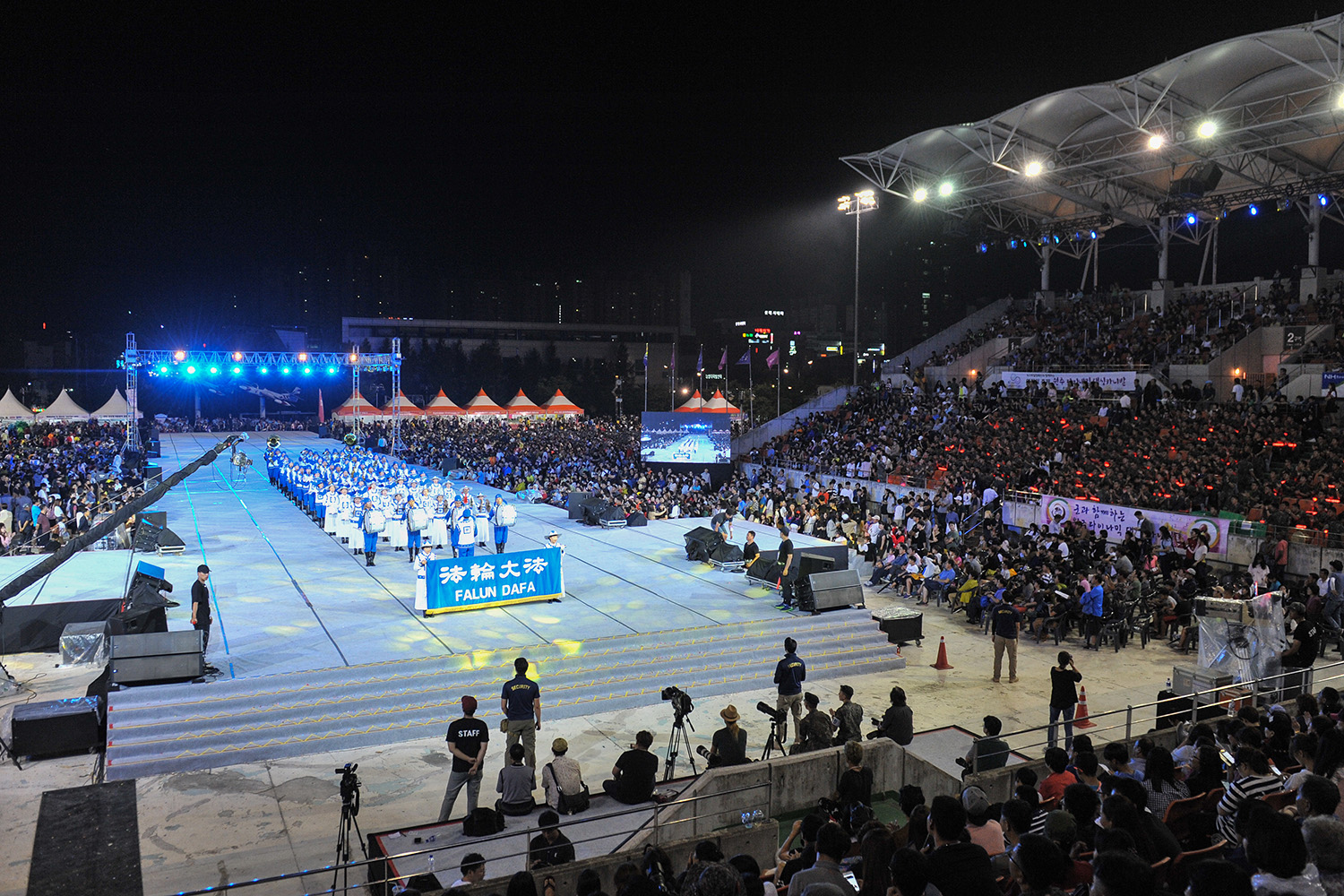 接着,天国乐团出现在一万五千个座位的原州 Tattoo 剧场长达一百二十米的大型特设舞台演奏时,观众们报以热烈掌声与喝彩。