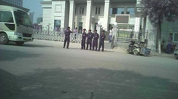 一大早天津市东丽区法院警戒森严,天津当局动用了百十号的警员和便衣,三步一岗五步一哨,还有警察来回巡逻,法院外面至少停着十辆警车和特警的车辆,一辆地方牌照的车上放着两个对讲机,一个女人的声音在布置:冻一、冻二、冻三、冻四向法院东侧大道集结。