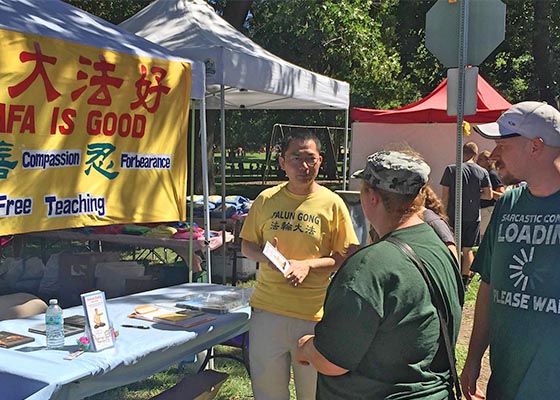伊州中部法轮功学员参加菊花节并设立了展位,向民众讲述法轮功受迫害的真相,并征集“反活摘”签名。两天下来,有近两百民众签名。
