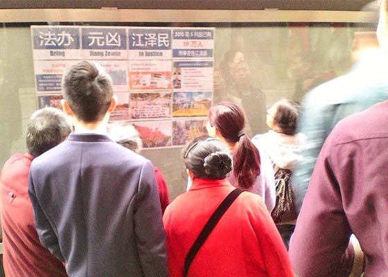 在我县城区大集贸市场,很多人聚精会神的观看法轮大法弟子张贴的诉江真相海报,一男子还饶有兴趣的一字一句的念给大家听。