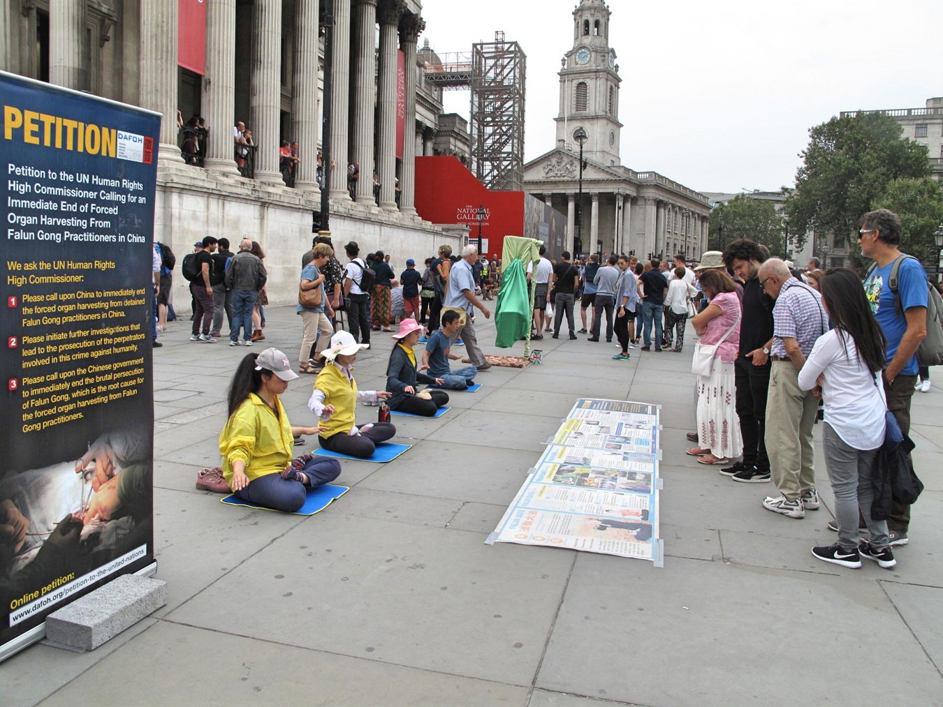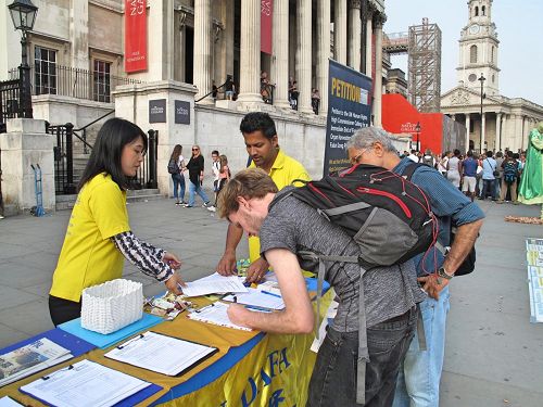伦敦是国际最著名的旅游中心城市,特拉法加广场(Trafalgar Square)是位于伦敦最中心的世界游客必到之地。在尚属旅游旺季的周末,当天特拉法加广场北台阶游人如织,有多种表演娱乐项目同时进行。法轮功学员的出现,如同在闹市中出现一片净土。在六个小时的活动过程中,法轮功学员不停地演示功法,吸引了人们持续不断的注意力,也有很多人的目光被反活摘征签的真相展板所吸引。有的法轮功学员则在人流中派发真相传单、向驻足的民众详细讲述法轮功的真相,走到真相信息台前来签名反活摘的人流也一直不断。