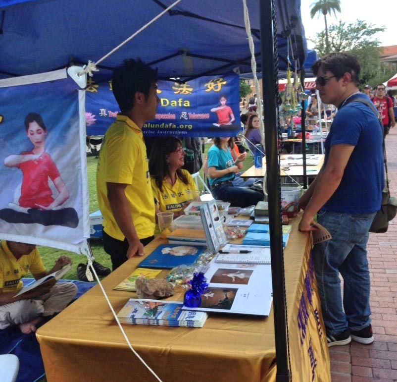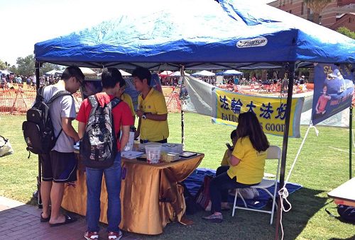 ![]() 图1-2:亚历桑那大学法轮功社团在社圃迎新活动设立摊位,向师生传播法轮功真相。 |