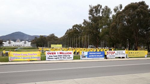 <英文版: http://en.minghui.org/html/articles/2016/9/3/158533.html>澳国会前集会 敦促总理访华关注法轮功(图)