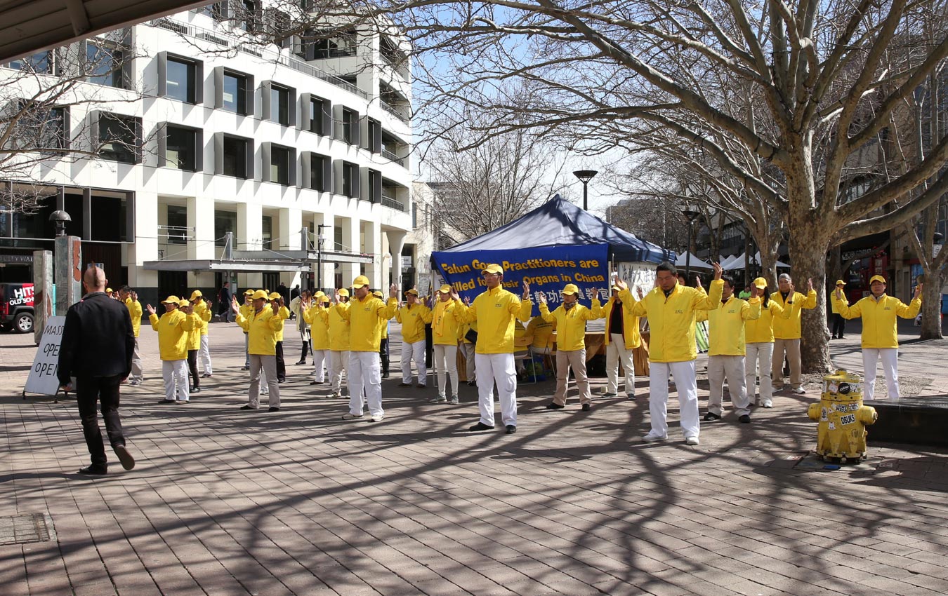 ![]() 图4:集会之后,澳洲的法轮功学员继续在堪培拉的商业中心向民众传播法轮功的真相。图为法轮功学员正在演示第二套功法——法轮桩法 |
