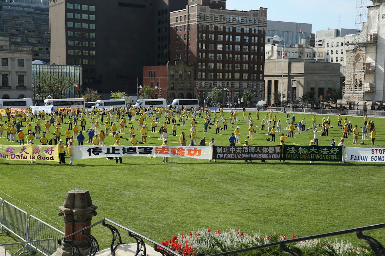 ![]() 图4:法轮功学员在加拿大国会山前炼功,并打出横幅,呼吁停止迫害。 |