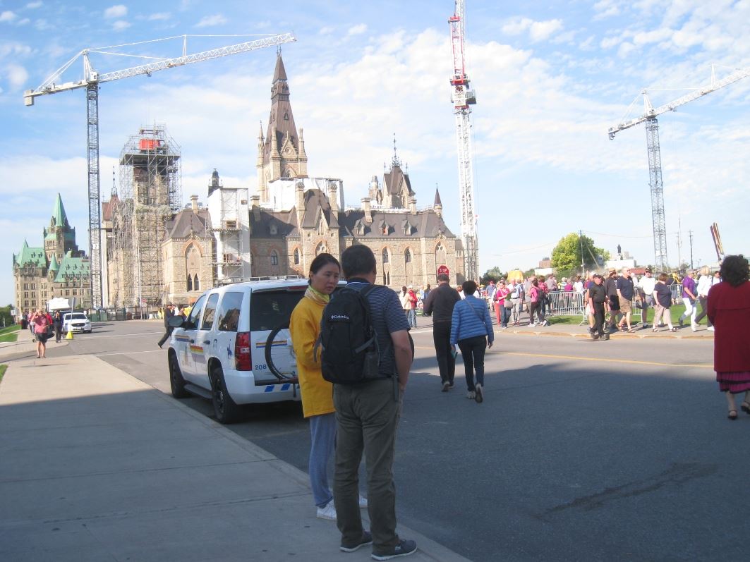 法轮功学员在国会山附近走路去另一地点时,路上很碰巧的遇到了来自于卡尔顿选区的国会议员Karen McGrimmon女士。McGrimmon议员对法轮功学员说:“你们举办的活动做的非常好,我支持你们!”