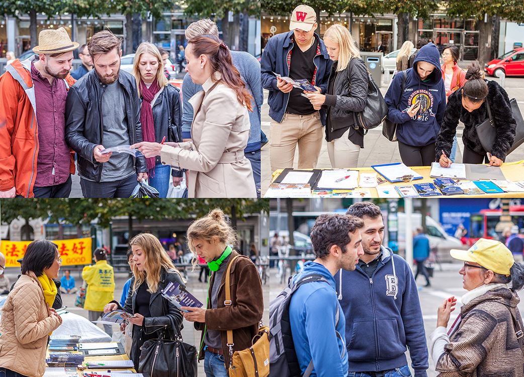 人们都被现场的活摘器官模拟演示所震惊,有的看展板,有的主动接真相资料。很多人当即签名支持制止中共对法轮功学员的血腥迫害。一对瑞典中年夫妇,男士认真阅读了展板后,表情严肃、径直走到征签簿前,签名支持制止迫害,他边签边对身边的妻子说:“你也过来签个名吧,这事(迫害)必须要制止!”