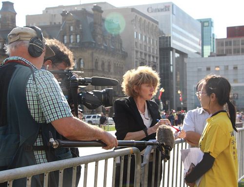 图1、2:加拿大广播公司电视采访法轮功学员。