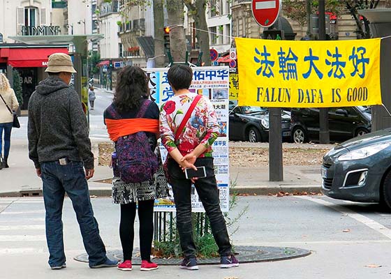 一批又一批在巴黎的景点观光和购物的大陆游客,听了法轮功学员讲的真相,登记三退保平安的同时,主动了解法轮功并表示赞同与支持。