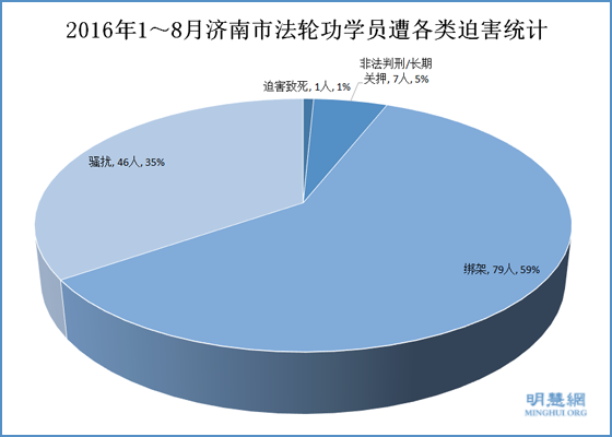 据明慧资料不完全统计,2016年1至8月济南市法轮功学员有7人被非法判刑或长期关押,一人被迫害致死,79人被绑架,46人遭骚扰迫害。