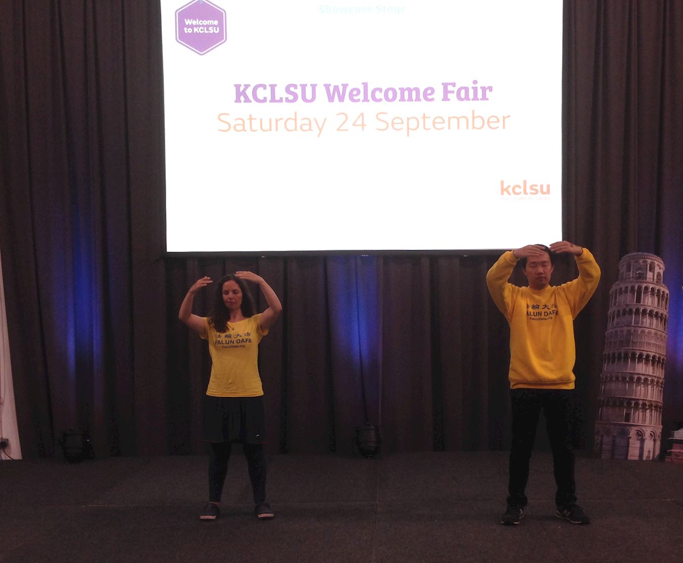 图1:二零一六年九月二十四日,法轮功学员在伦敦大学国王学院迎新会的大厅中心舞台上展示法轮功功法