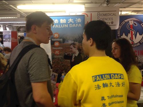法轮功社团展位在迎新会上的出现也给在伦敦大学国王学院就学的中国大陆留学生们带来惊奇,他们有的面带友好微笑接过法轮功真相传单,有的没接传单但在一旁驻足对着法轮功真相展幅拍照留念,还有多位主动和法轮功学员交谈并表示会去进一步了解法轮功。