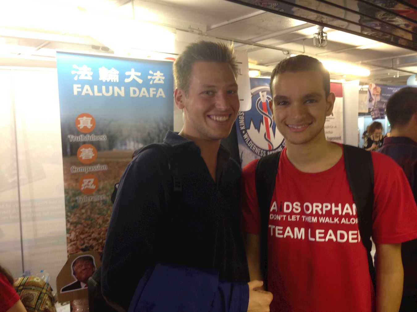 图6:二零一六年九月二十四日,在伦敦大学国王学院学商业管理的大二学生阿力山大(Alegsandro,左边一位)和他的朋友山姆(Samy)先后报名参加法轮功社团,并高兴地在法轮功展位前留影