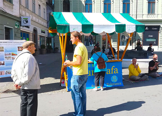 九月二十五日,斯洛文尼亚法轮功学员在首都中心大广场上设立真相点,向当地民众揭露中共十七年来对法轮功学员的残酷迫害。